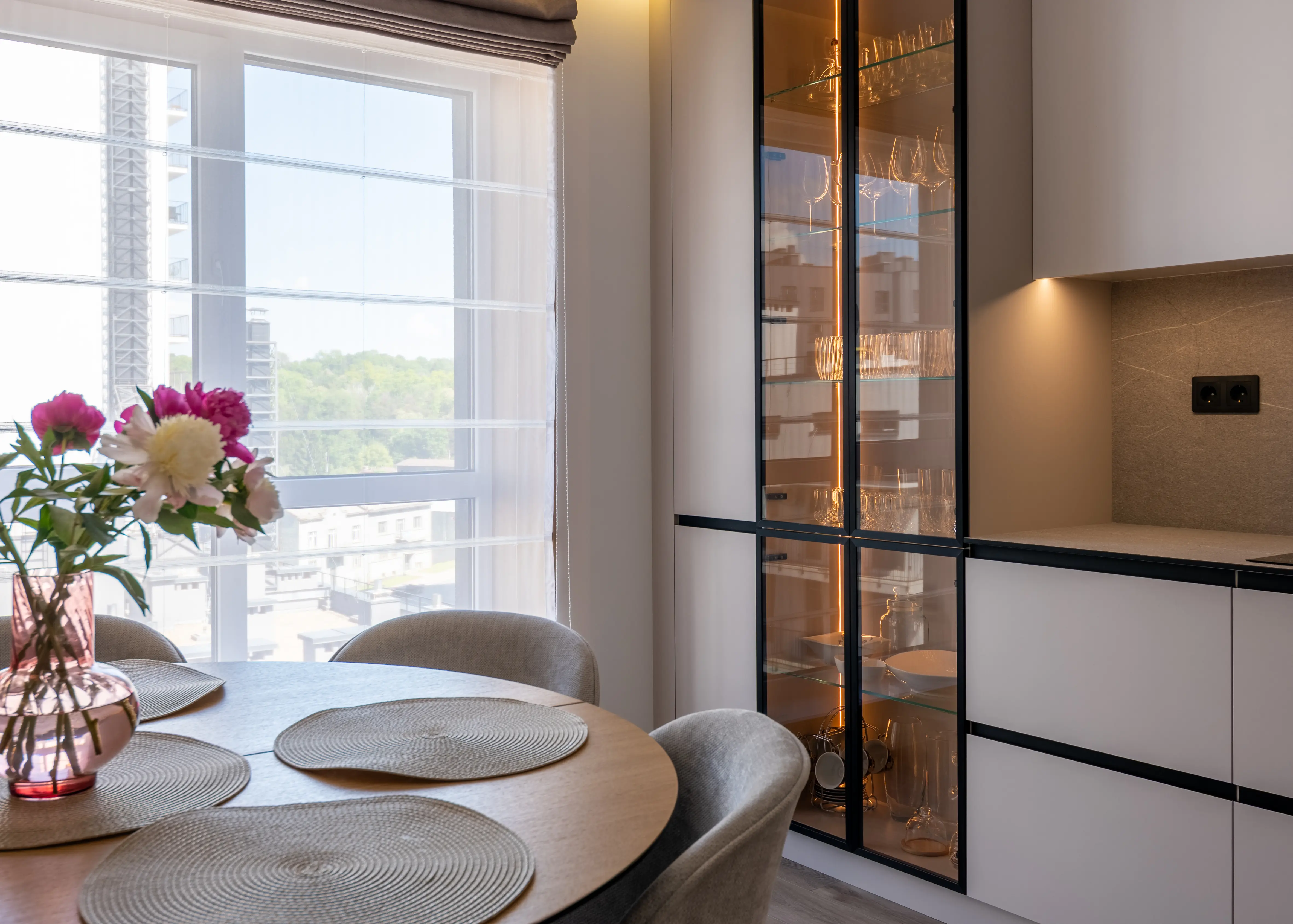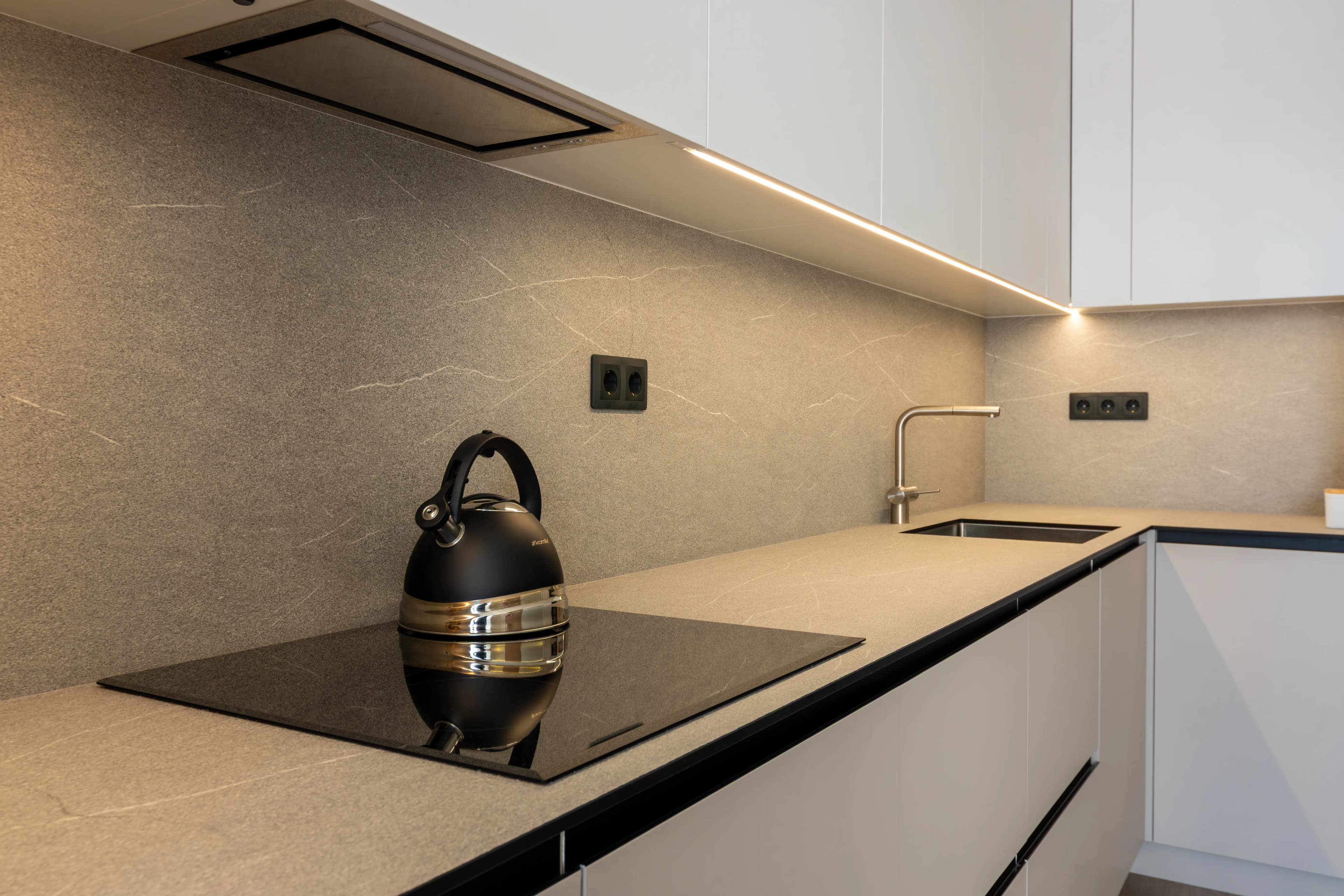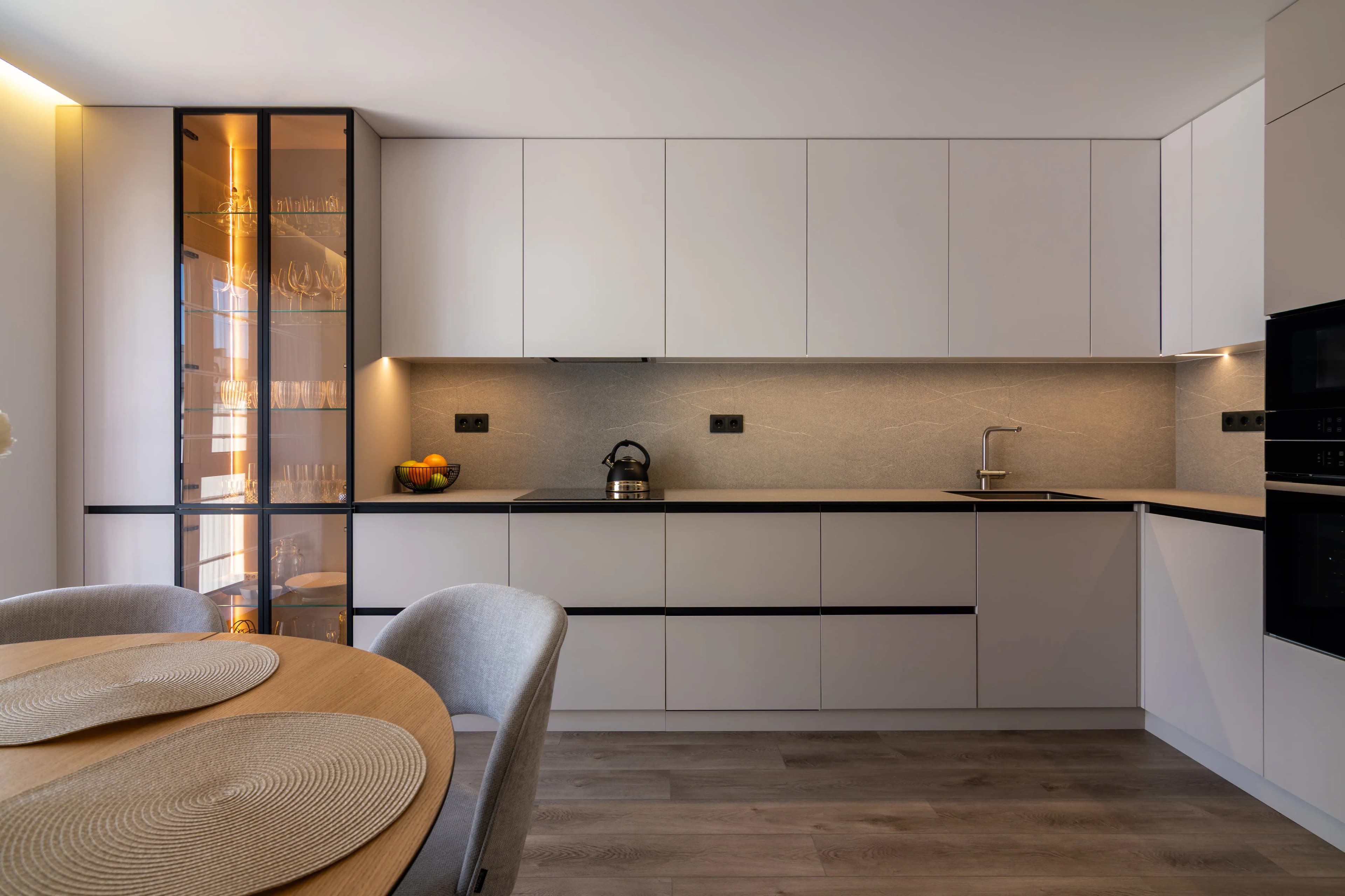 Minimalism that looks luxurious. This kitchen is designed for those who appreciate the combination of aesthetics and functionality. The fronts and bodies are made of Egger chipboard, which harmoniously combines white and cashmere colours. The HPL worktop is incredibly convenient and practical for everyday use, as it is made of extremely durable and moisture-resistant material, making it wear-resistant and easy to clean. High-quality fittings ensure smooth and comfortable use of drawers and lifting mechanisms. This minimalist kitchen option is ideal for those who appreciate a combination of aesthetics, sophistication and practicality in their interior.