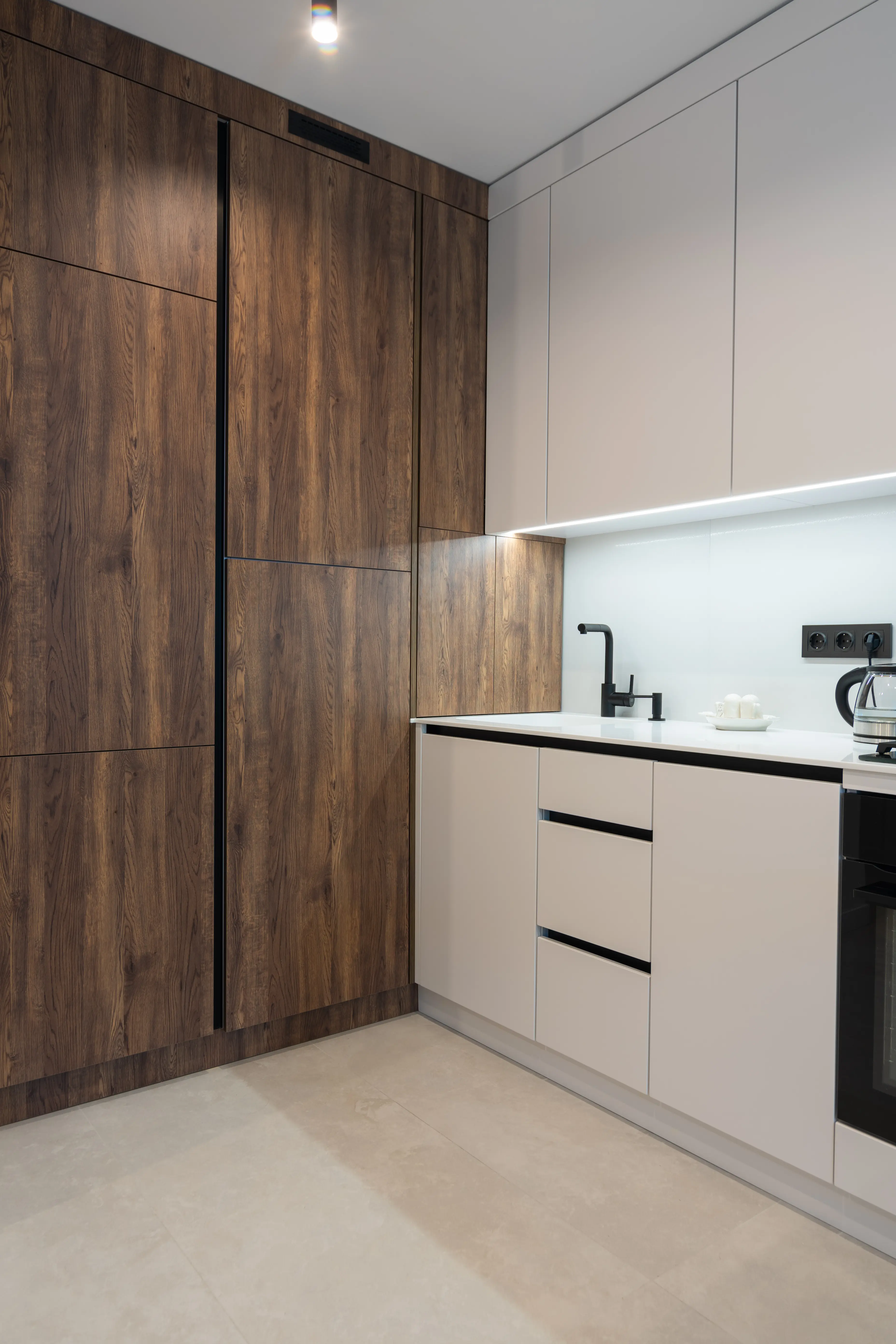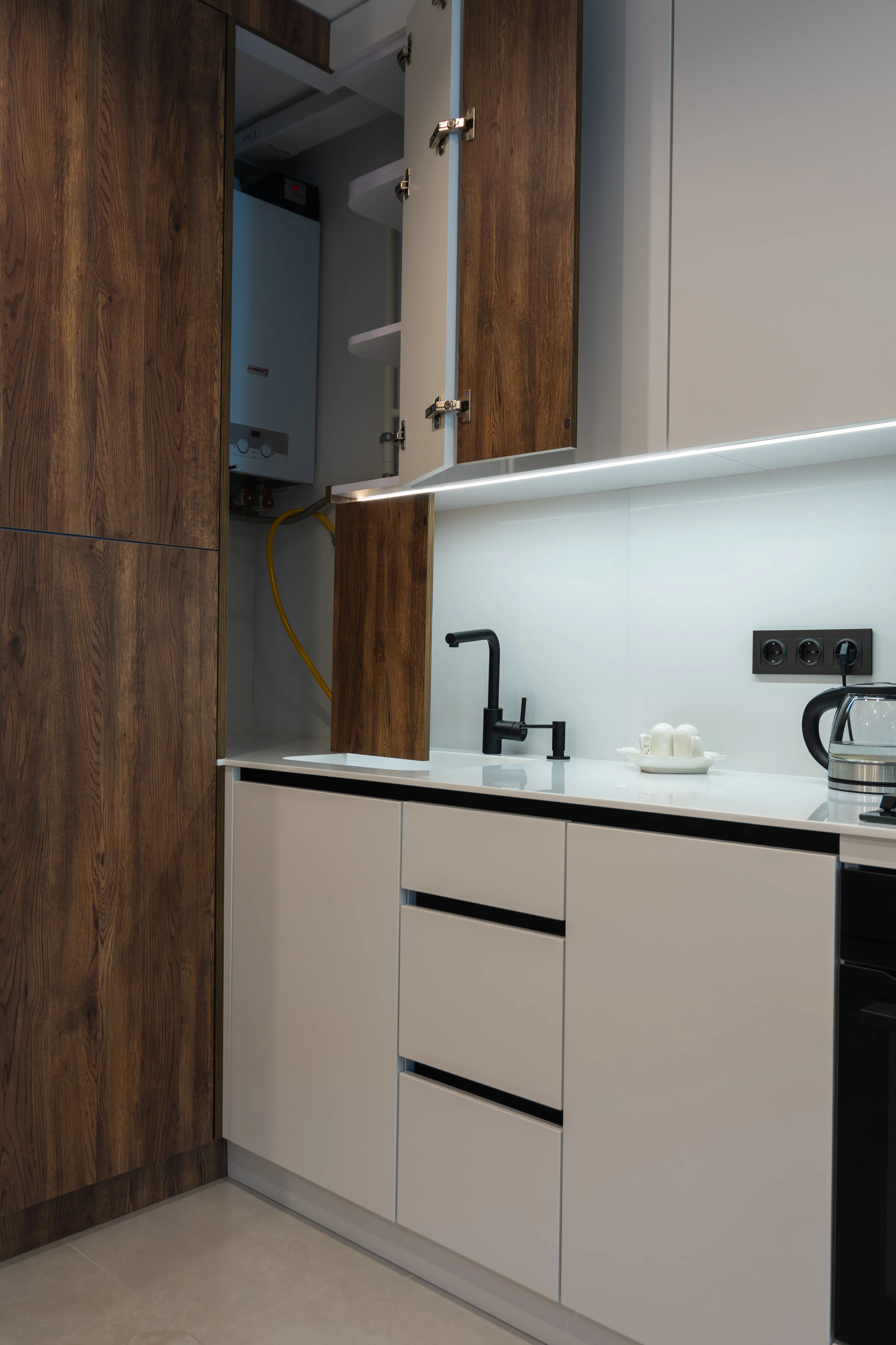 Each project is unique, and this kitchen is a striking example of combining non-standard solutions and comfortable placement of technical components. The facades are made of white painted MDF, which creates a sense of depth and cleanliness. The wood-like chipboard cabinet is designed to integrate a large water softener filter, and the corner sections open with a double front, providing full access to the boiler. What's more, there is space underneath with shelves for storing appliances or household appliances. The use of a thin worktop and an acrylic stone apron that matches the colour of the kitchen has created an effect of weightlessness and lightness. This small but well-designed kitchen combines style, comfort and functional solutions, demonstrating the professionalism of our team and attention to detail.