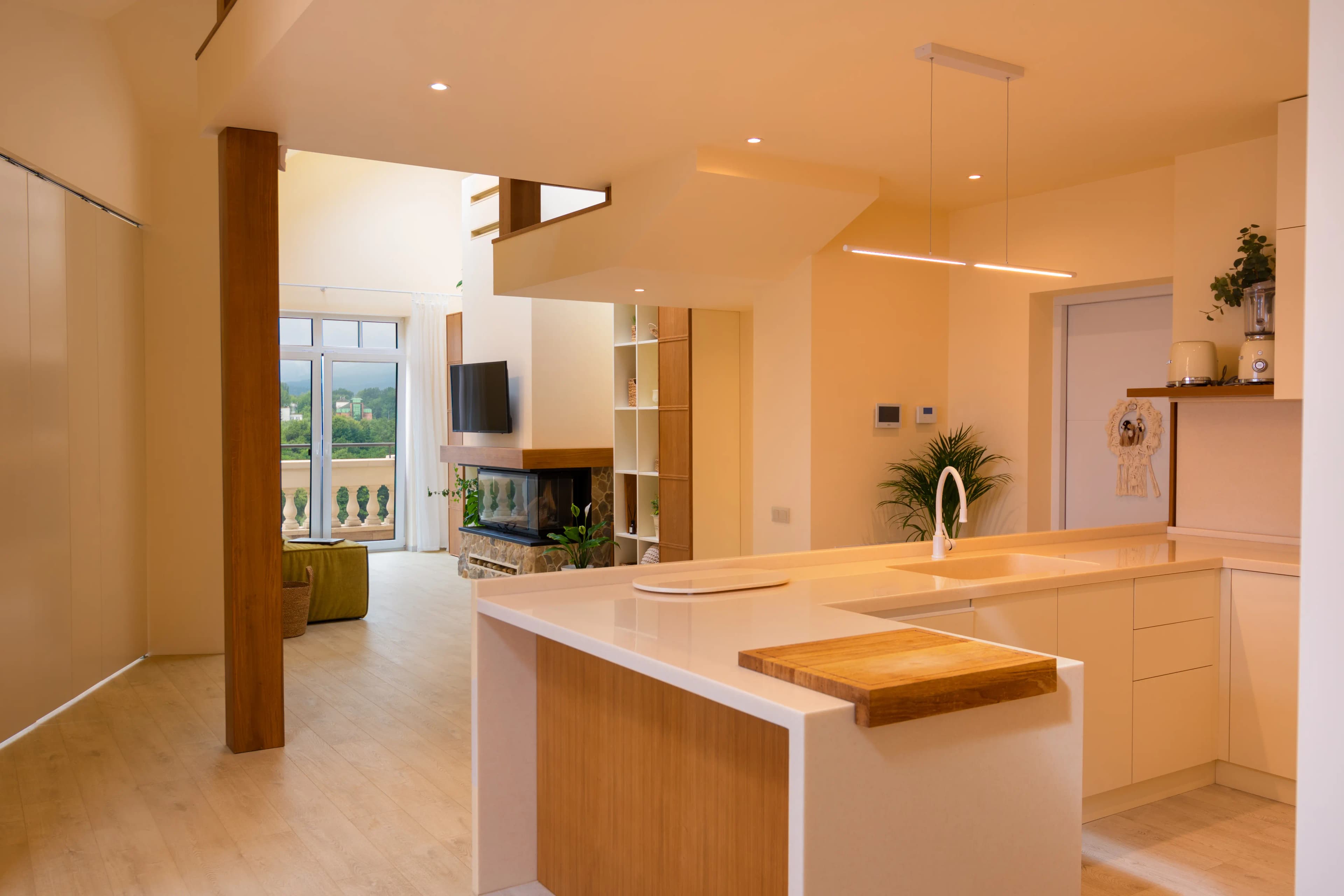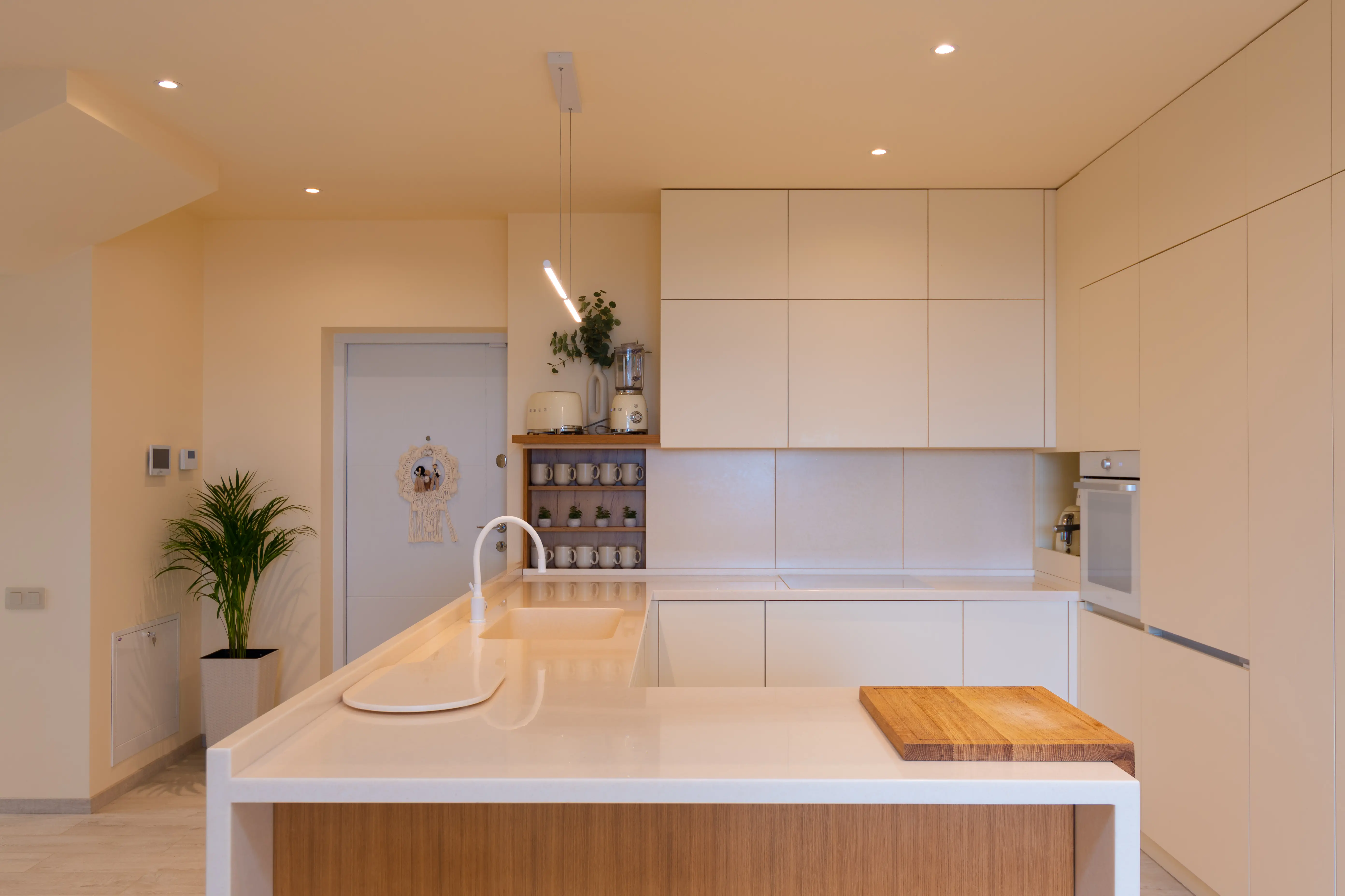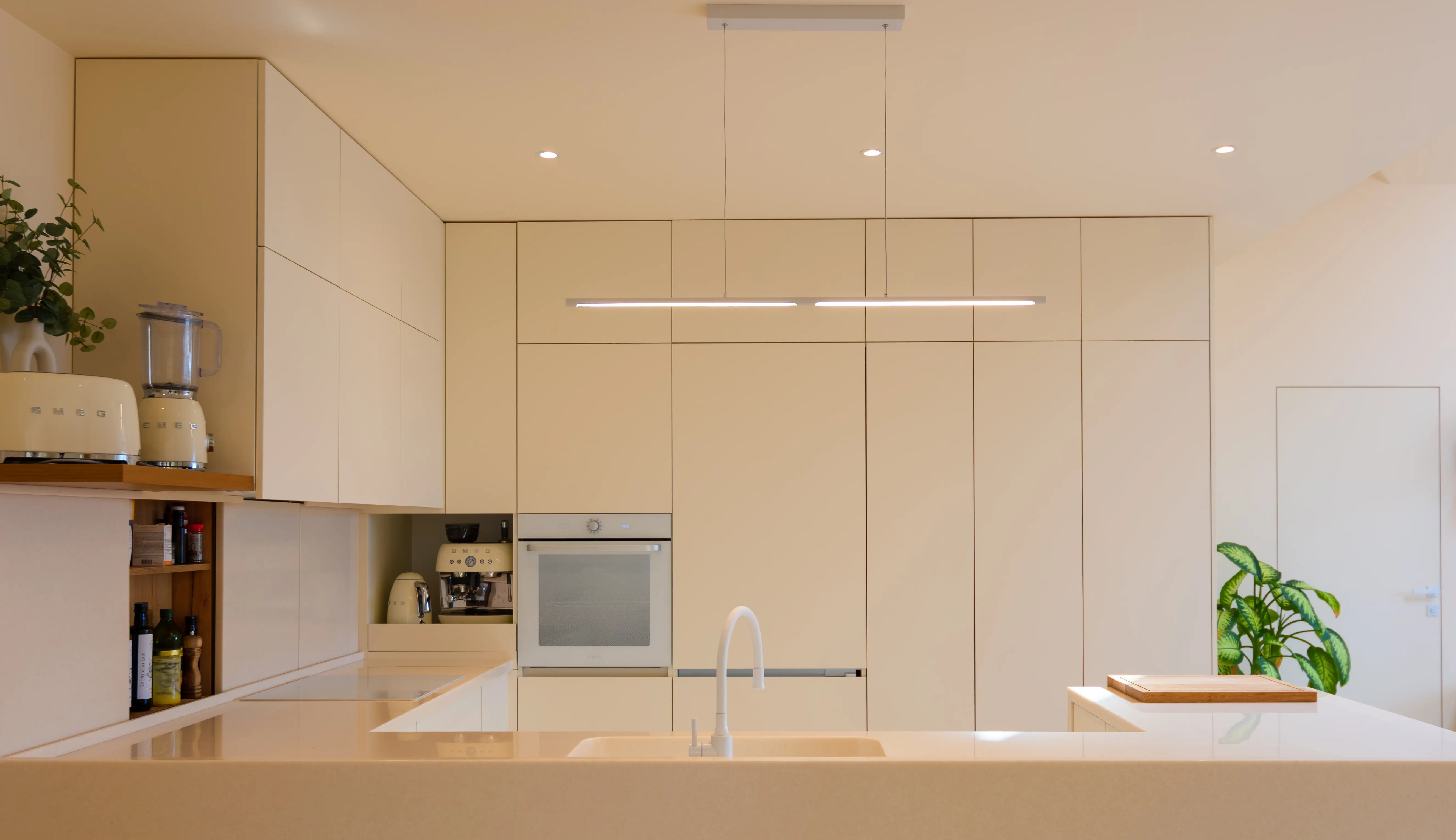 The kitchen is not just a place for cooking, but a space where the family gathers to enjoy culinary masterpieces and conversation. We have ensured a beautiful and functional design by using modern materials and high-quality fittings for this project. The kitchen fronts are made of matt acrylic from Niemann in a soft beige shade, and the coating has hydrophobic properties, making the surfaces easy to clean. The monolithic worktop and sink, as well as the apron, are made of Grandex acrylic stone. It is a durable and damage-resistant non-porous material that does not absorb liquids, does not form mould or stains, and is therefore practical to use. For an extra touch of warmth and cosiness, the design features oak veneer elements on the front panels. Special attention has been paid to functionality: a hidden pantry behind the kitchen fronts helps to keep things tidy, while modern Blum fittings ensure that drawers and doors open smoothly. The kitchen is equipped with all the necessary appliances and storage systems to simplify the cooking process as much as possible. This option is ideal for those who appreciate a combination of aesthetics, comfort and practicality in their interior.