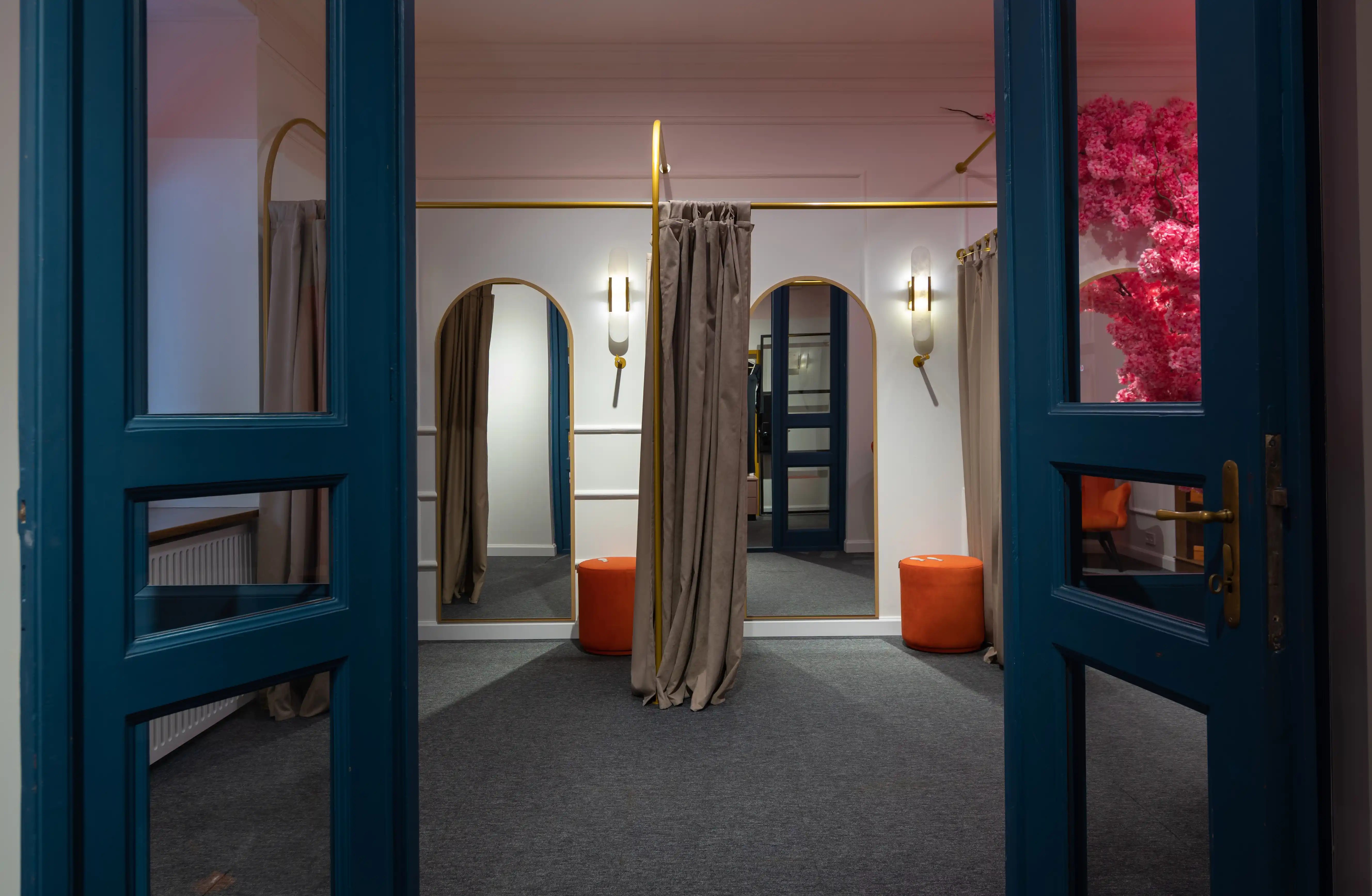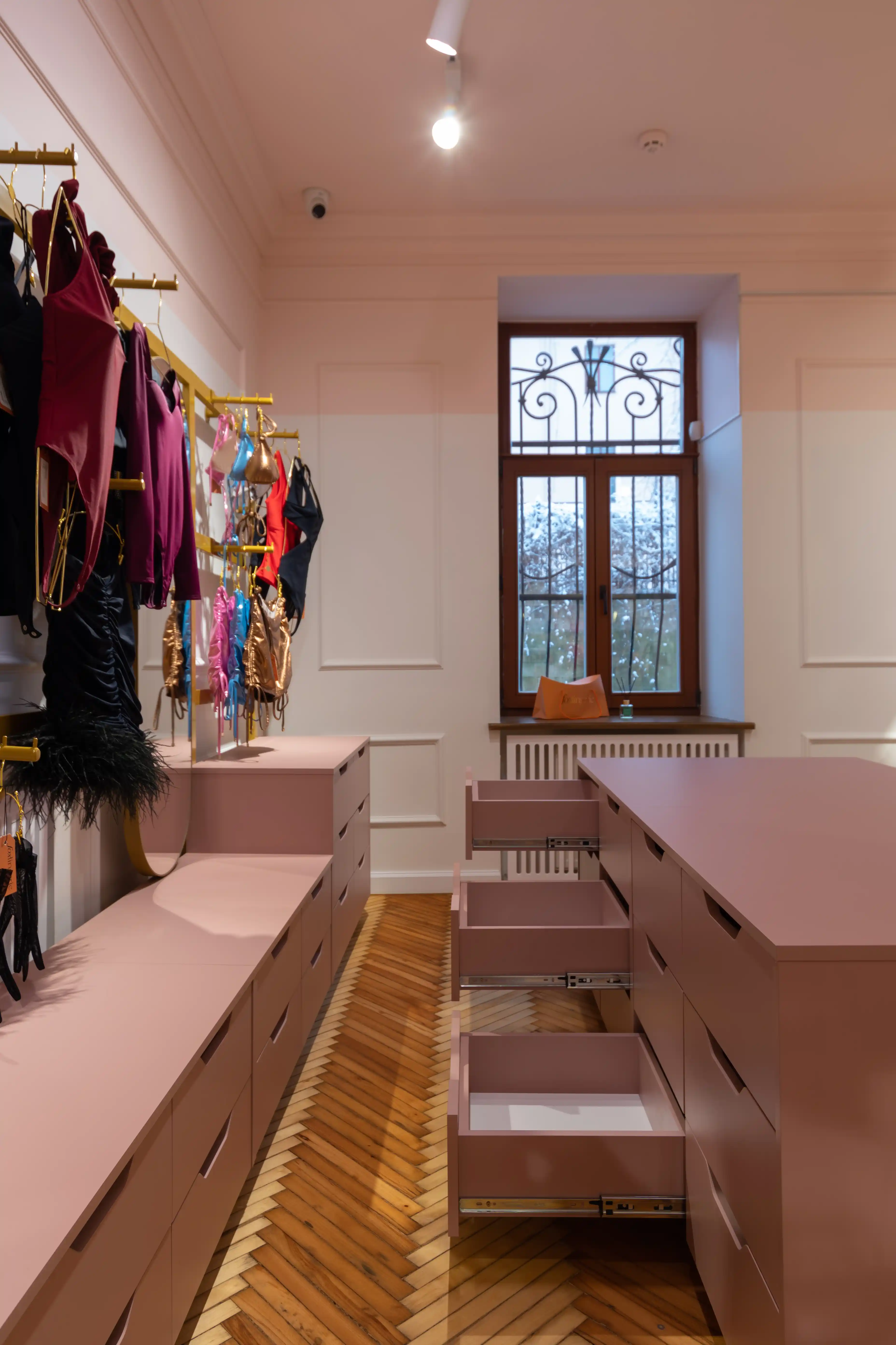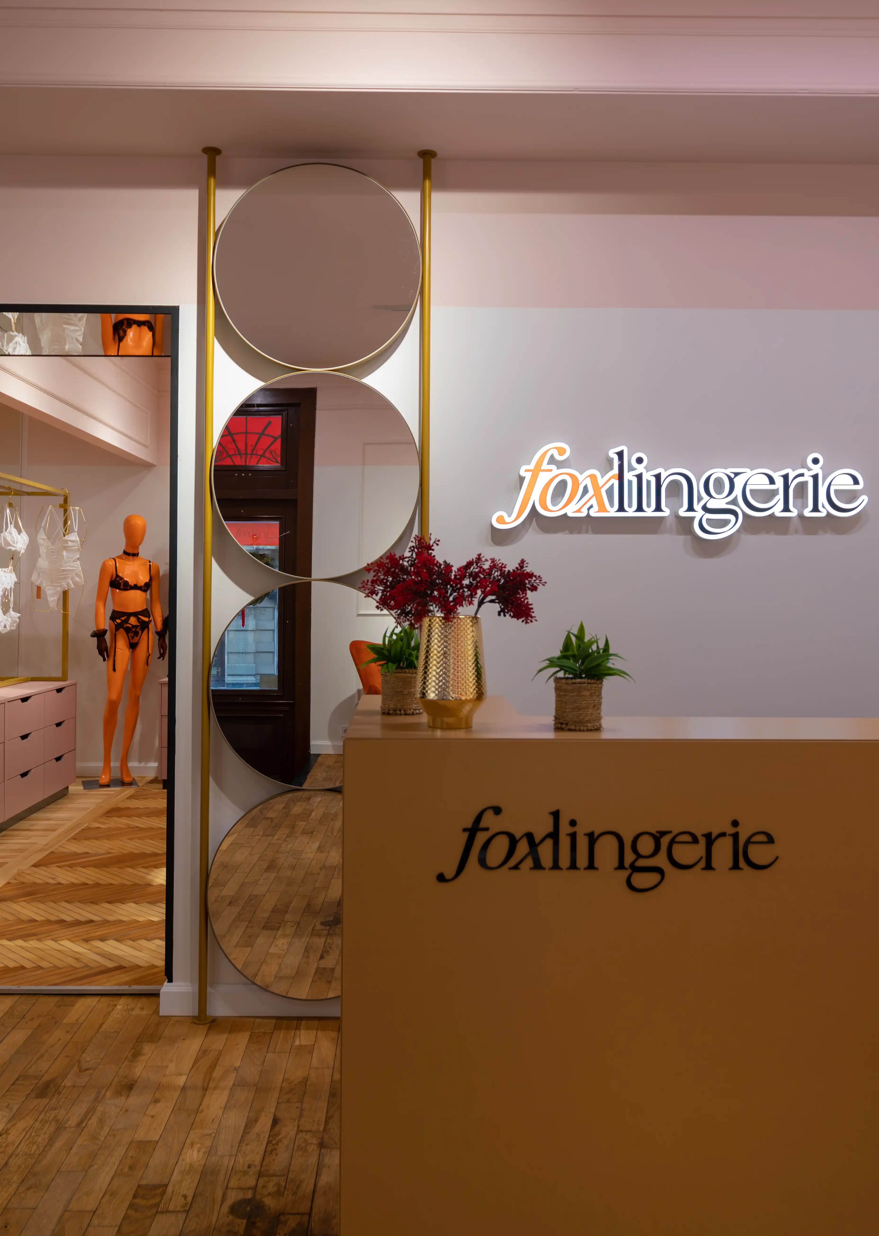 Інтер’єр покликаний підкреслити жіночність бренду та створити атмосферу комфорту й довіри для простору Fox Lingerie. Центральним елементом простору стала рецепція, виготовлена із золотої ДСП Egger і матового металу. Усі кути конструкції мають зріз 45 градусів, що підкреслює професійність виконання. Комоди виготовлені з ДСП Egger у кольорі рожевий антик та оснащені якісними напрямними від GTV з дотягом для плавного й безшумного закривання. Пристінні металеві вітрини для одягу пофарбовані у відтінок золота (RAL 1036), що додає інтер'єрові вишуканості. Цей проєкт - приклад того, як індивідуальні меблі стають частиною айдентики бренду, підкреслюючи його стиль і характер.