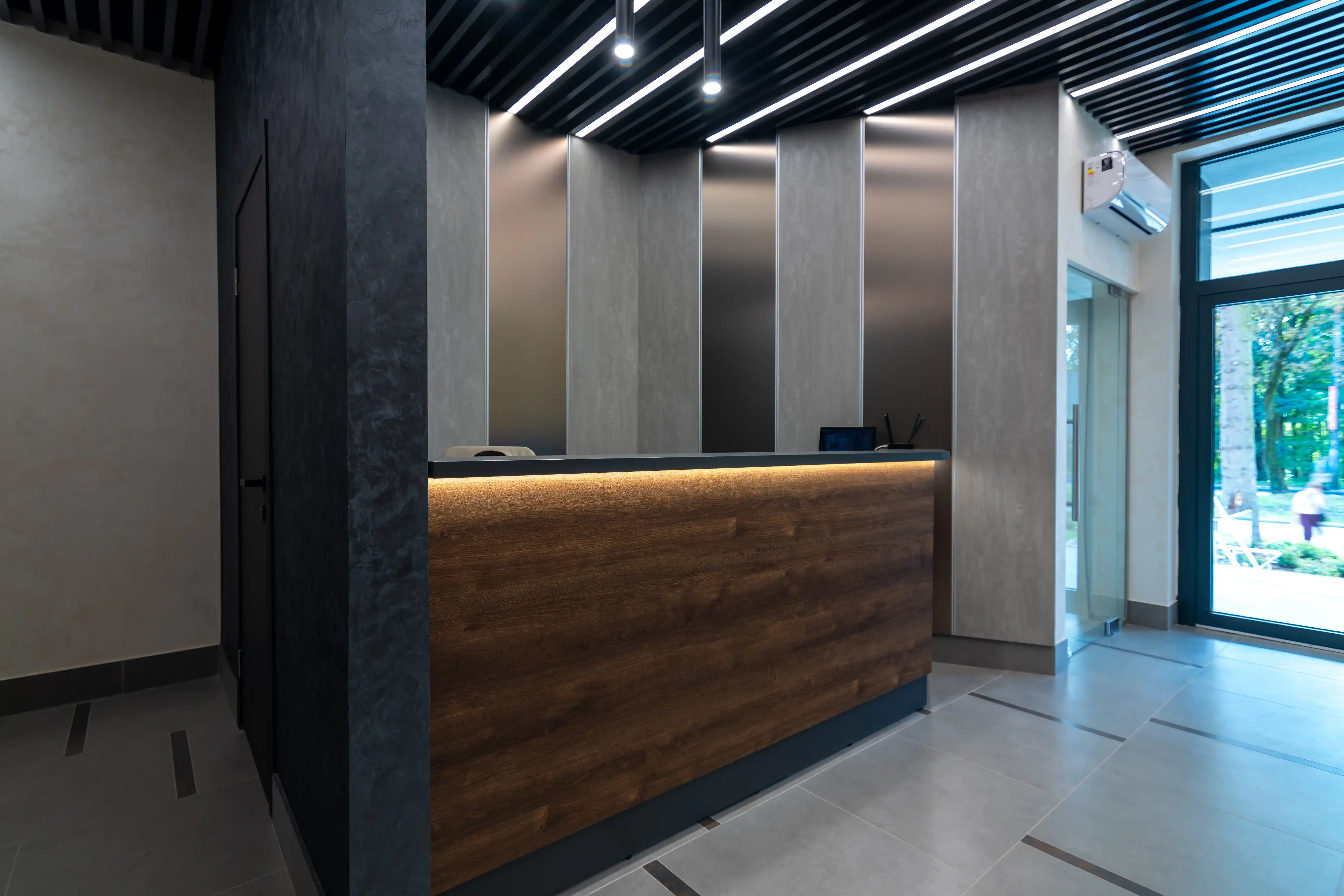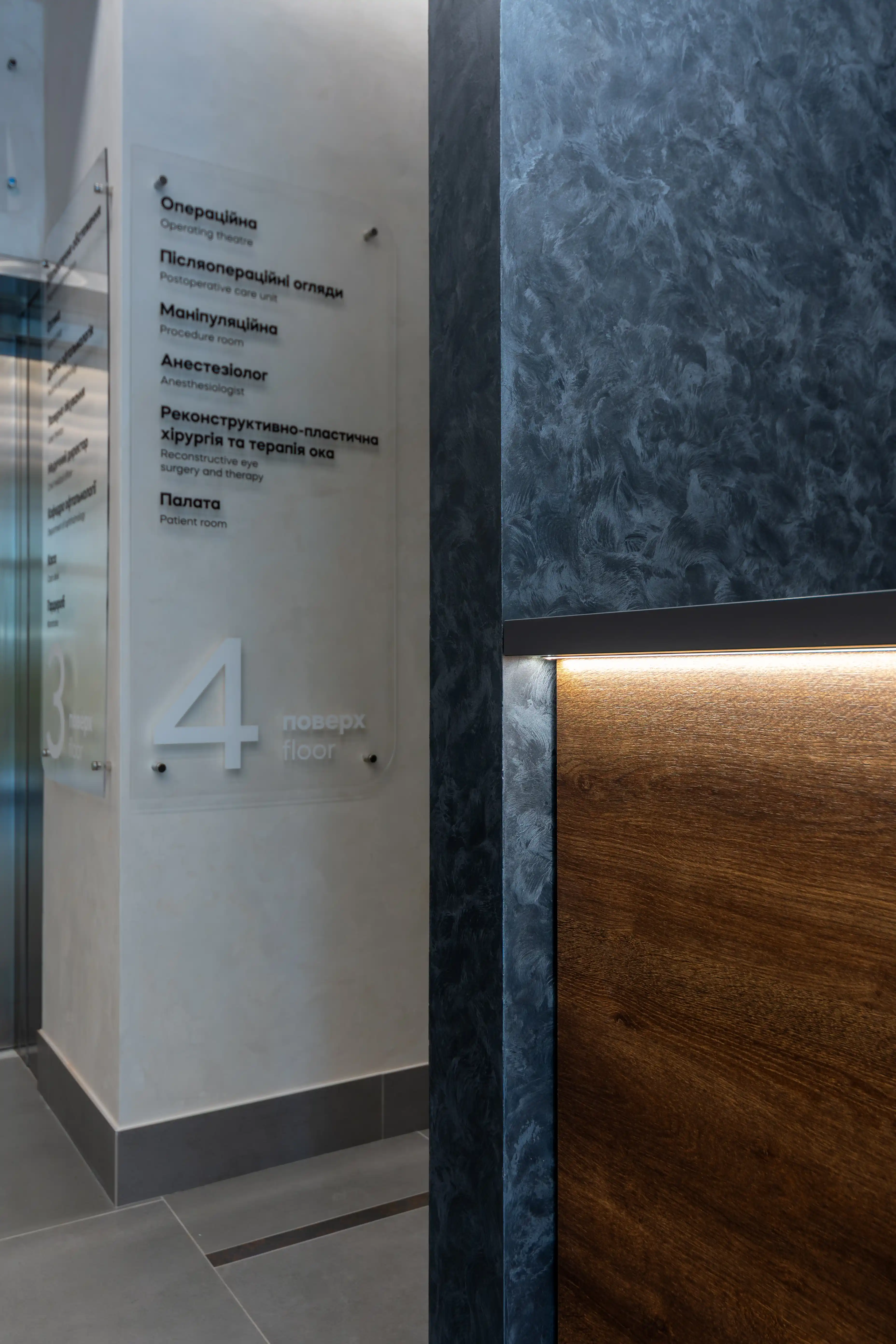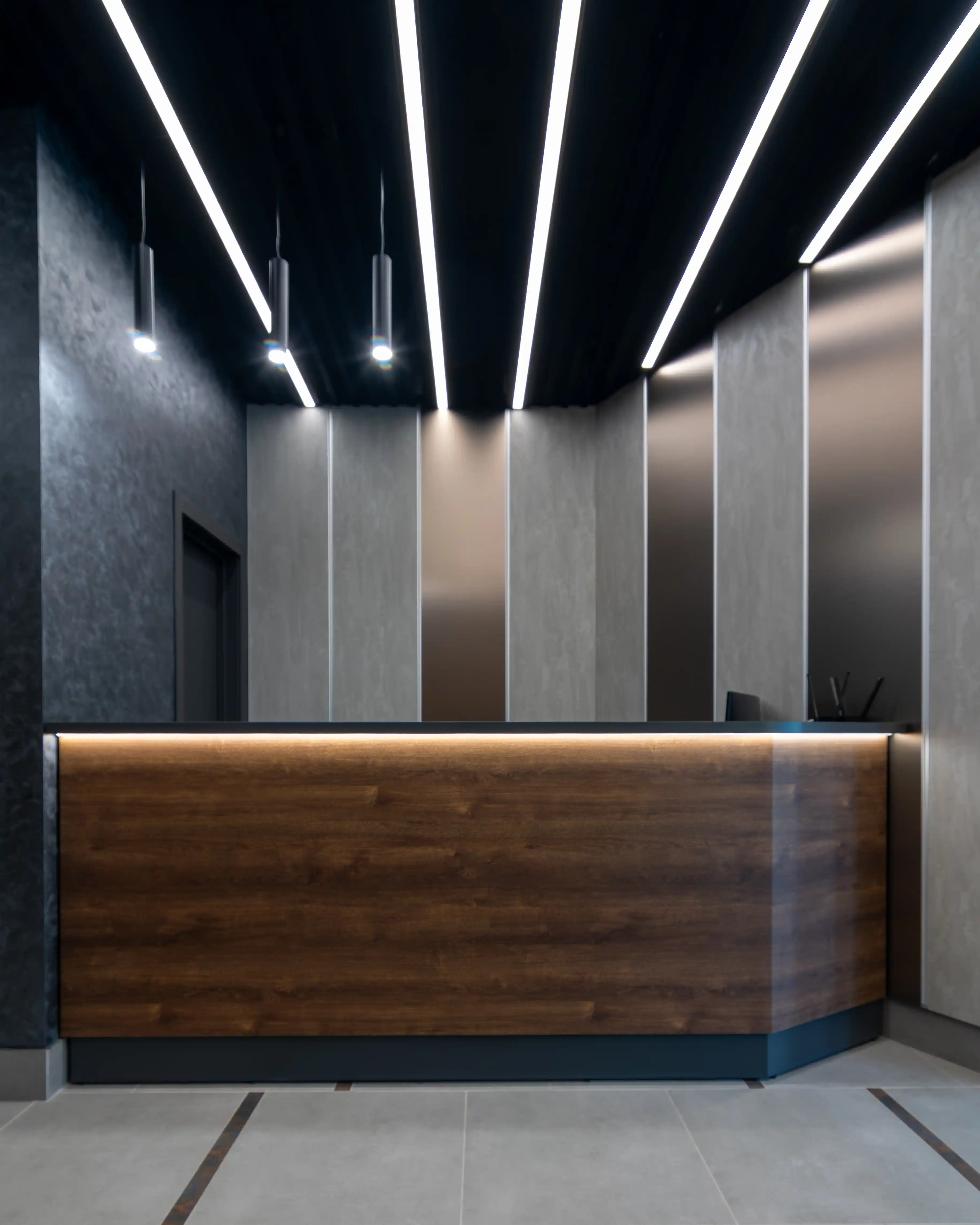 Інтер’єр цієї зони створений для того, щоб з перших секунд сформувати відчуття комфорту й довіри до простору. Фасад виконаний з ДСП Kronospan дуб експресив бронзовий, природна текстура якого влучно підкреслена врізною LED-підсвіткою. Світло делікатно огортає лінії меблів, додаючи інтер’єрові глибини й сучасного характеру. Верхня частина й акцентні елементи зони виготовлені з ДСП Kronospan в антрацитовому кольорі. Контраст темних поверхонь із теплою деревною фактурою створює стриманий вигляд, що гармонійно вписується в загальну концепцію простору. Цей проєкт демонструє, як продумані меблеві рішення поєднують комфорт та естетику, стаючи важливим складником першого враження.