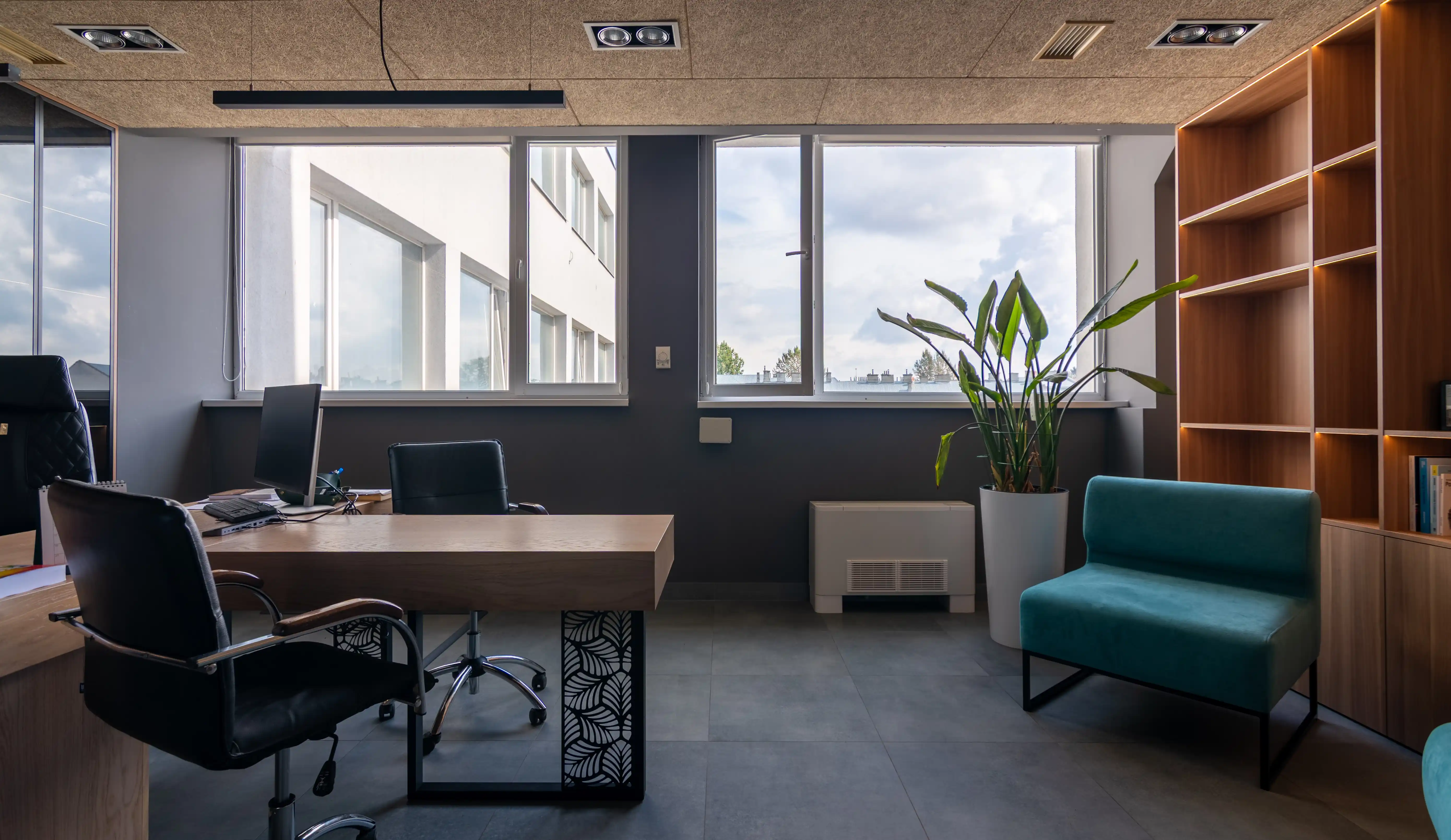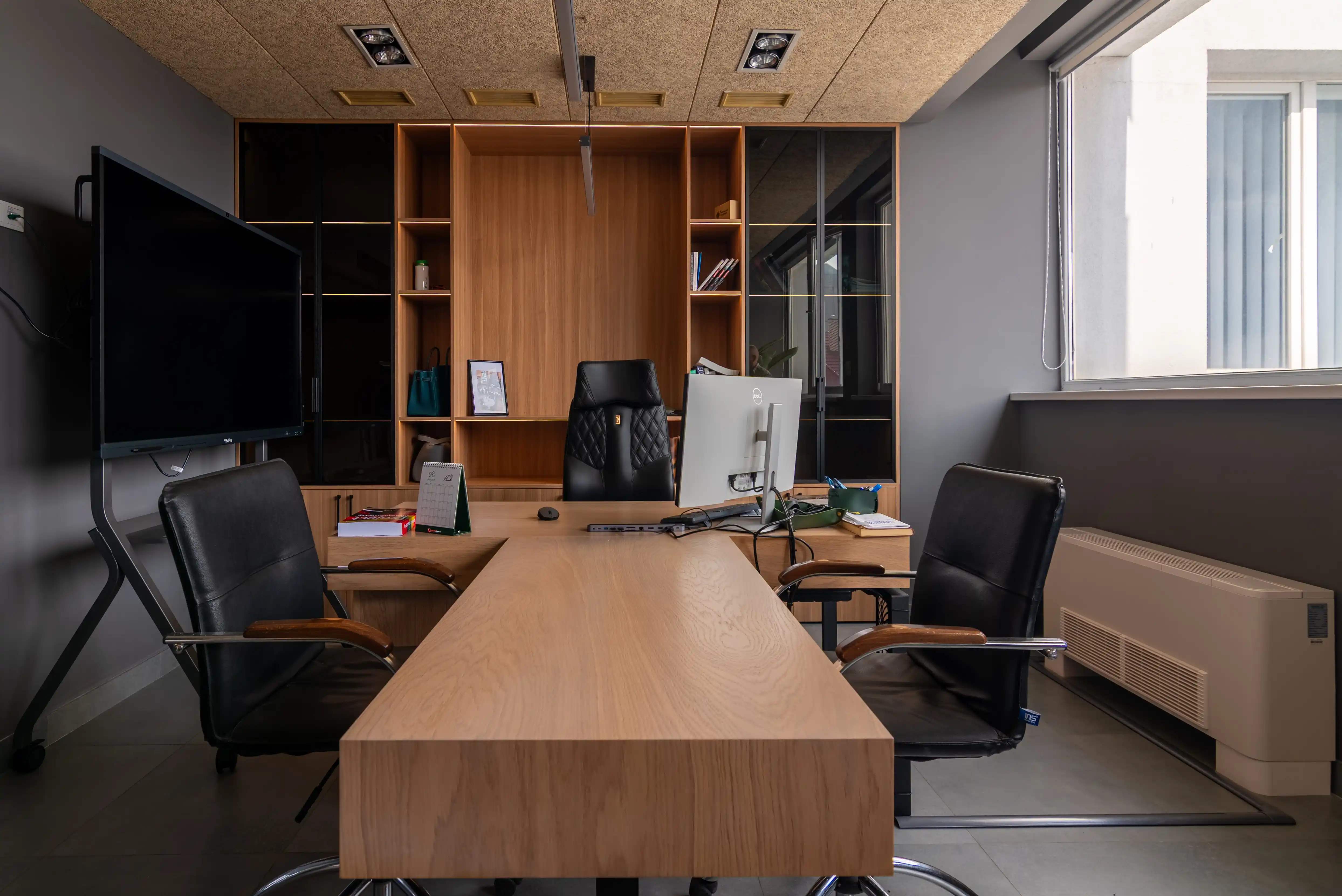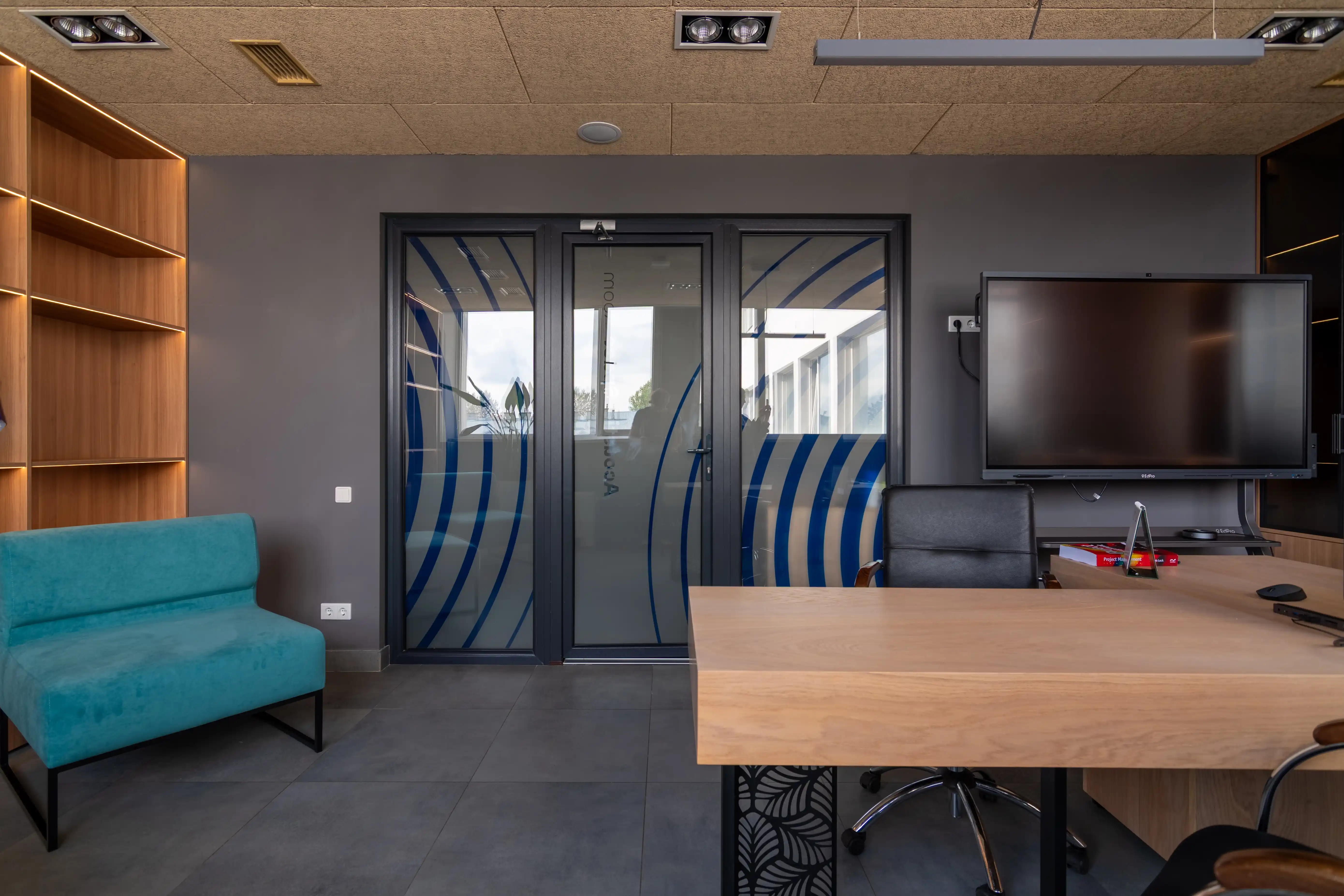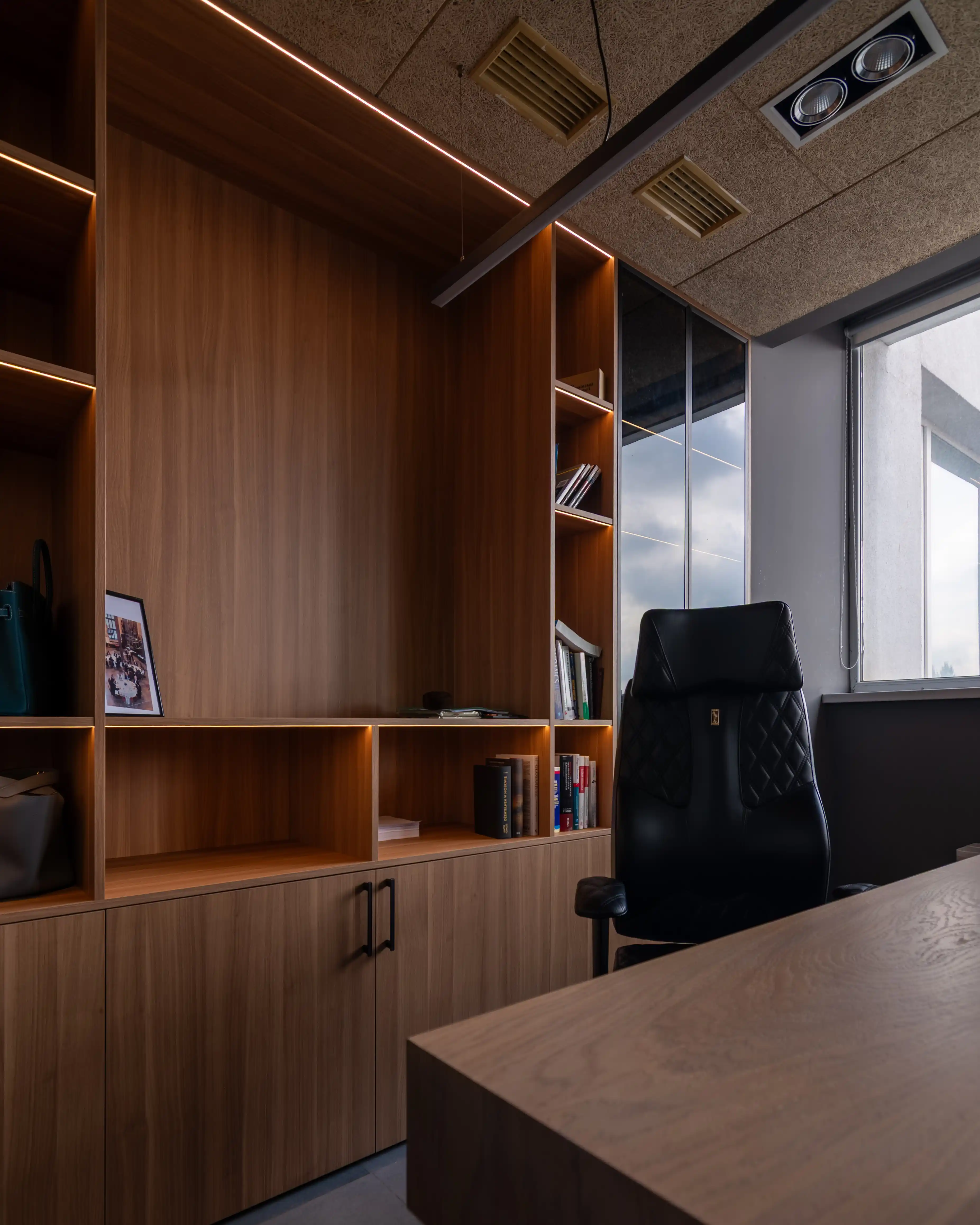 В інтер’єрі кабінету керівника поєднані природні текстури й сучасні деталі, що формують відчуття статусності й комфорту. Стелажі виготовлені з ДСП Egger у кольорі горіх парона, який додає інтер’єрові теплоти й глибини. Стіл виконаний з натурального шпону дуба, що підкреслює преміальність простору й створює приємну робочу зону. Для вітрин використано затемнене скло графіт, яке гармонійно поєднується з деревною текстурою простору. Особливої атмосфери додає вбудована LED-підсвітка, інтегрована в полиці, щоб створити м’яке, ненав’язливе світло. Усі меблі оснащені фурнітурою Blum, що забезпечує плавну, тиху й надійну роботу кожного механізму, відповідаючи високим стандартам комерційних інтер’єрів.